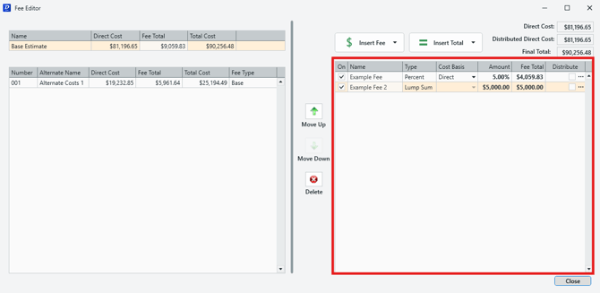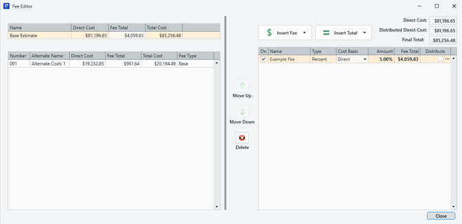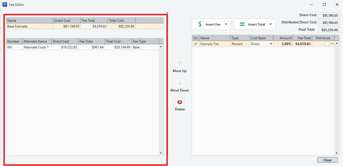 The left pane allows you to keep track how added fees affect the both your Base Estimate and each of the Alternates in the project. It shows the Fee Total, and the Total Cost after fees are applied, and is updated on the fly.