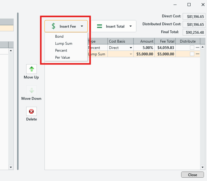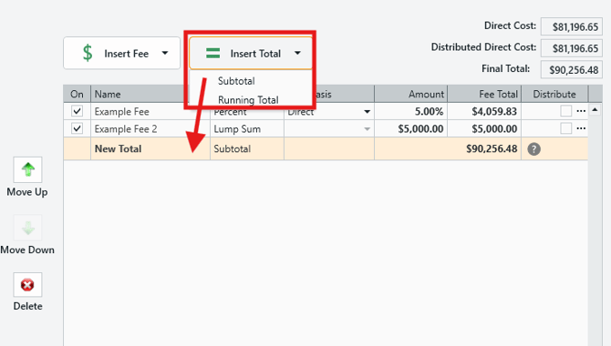 Insert Total - Lets you added a Subtotal or Running Total to your fee table. Totals can be renamed by clicking into the Name column.