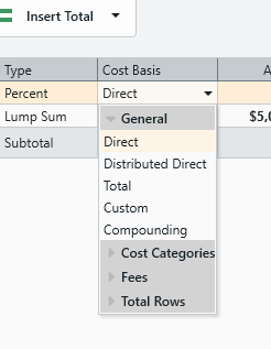 - Cost Basis: The parameters upon which the fee calculation will operate. A Percent-type fee, for example, can be calculated based on the Direct, Distributed Direct and Total costs, a custom or compounding cost, another fee, row total or Cost category.