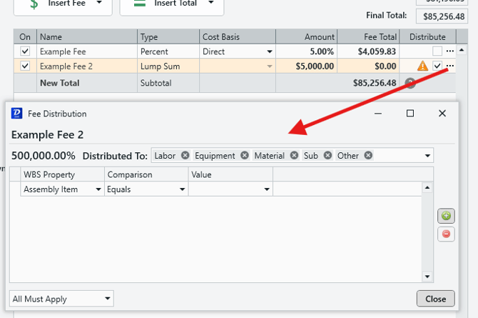 - Distribute: A checkbox option that allows you to distribute fees across one or more cost categories (labor, material, equipment, sub, other). Click the ellipses on the right to reveal the Fee Distribution window, where distribution conditions can be set (see below for more on the Fee Distribution window).
