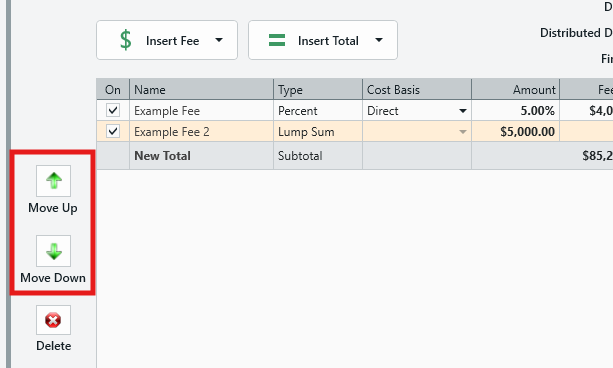 Move Up/Down Arrows: Allows you to move fees up and down in the table. This is important because fees are calculated from top-to-bottom.