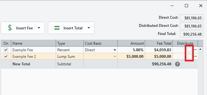 Distribute Checkbox: A fee can be distributed by checking the box in the Distribute column in the Fee Editor: