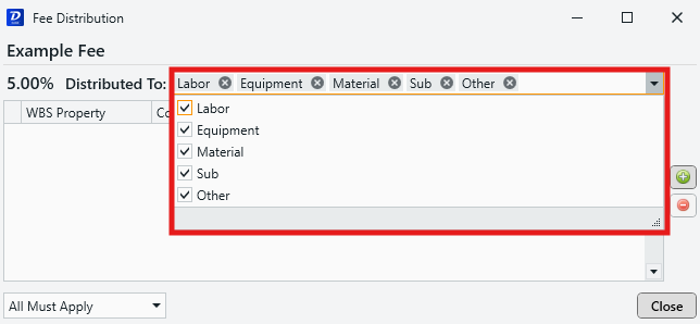 Distribute To: Determine which cost categories to distribute your fee to by adding/removing them from the dropdown field.