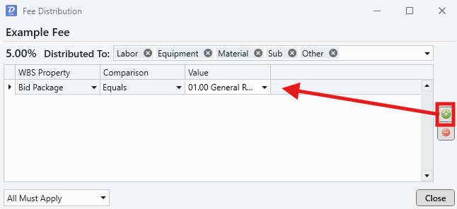 - All Must Apply: The fee is only distributed to line items that meet all of the listed criteria. Use this setting for a more restricted distribution method.