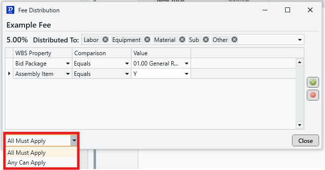 - Any Can Apply: The fee will be distributed to line items that meet any of the listed criteria. This is useful if you have several separate conditions that you'd like to specify for distribution.