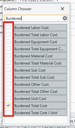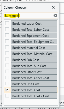 In the Column Chooser, search the word 'Burdened' for quick and easy access to the full selection of burdened cost columns available: