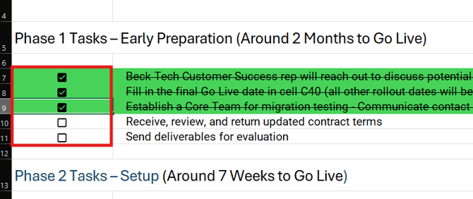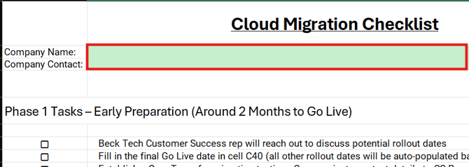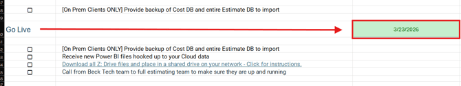 Rollout Dates - During early discussions with your Beck Tech Customer Success Rep, you should establish a rough date for going live in DESTINI Cloud. Insert this date into the green cell in the Go Live row (cell C40).The document will automatically populate all prior milestone dates in Column C.