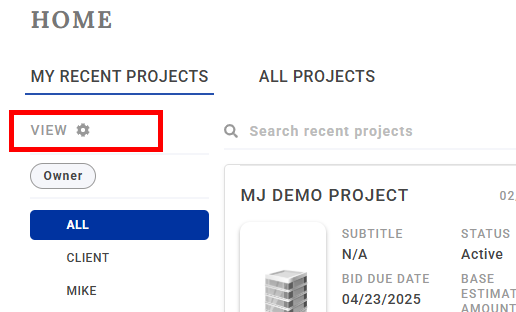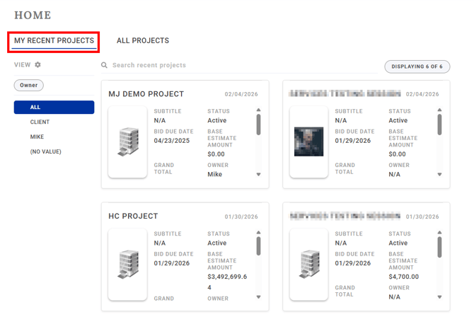 My Recent Projects is the default screen for locating your projects on the Bid Day Home screen. It will only display projects that you created or have previously opened.