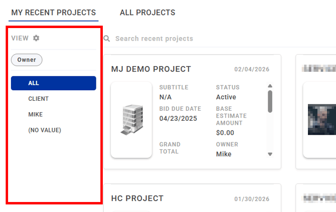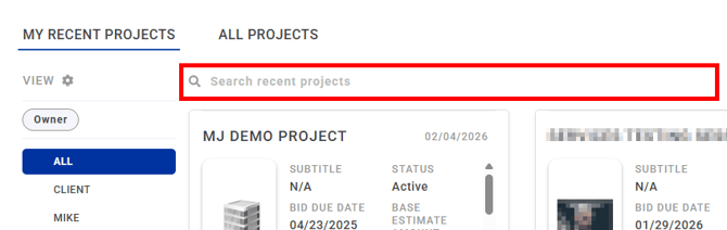 Bid Day aims to make locating your projects easy via a combination of search, filters and recent lists. These options are split over two main tabs, MY RECENT PROJECTS, and ALL PROJECTS (click to skip to the relevant section of this article).