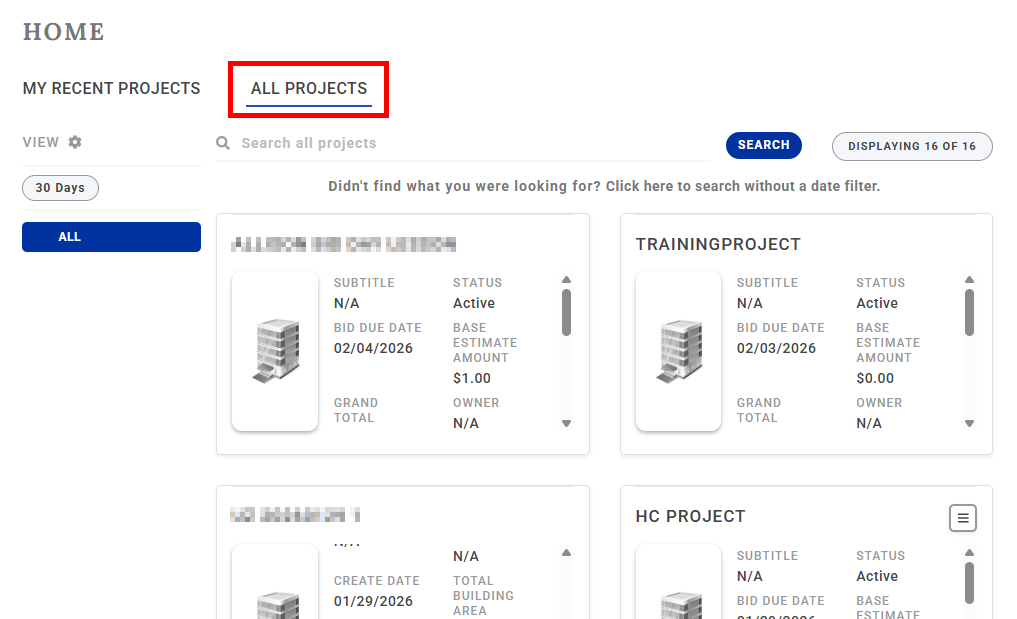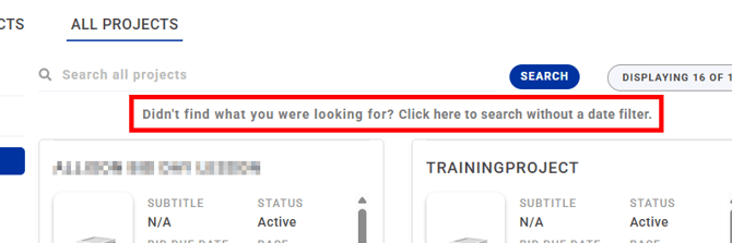 IMPORTANT: By default, the ALL PROJECTS tab filters projects to the last 30 days. If you would like to search with no date restriction, click on the option 'Click here to search without a date filter'.