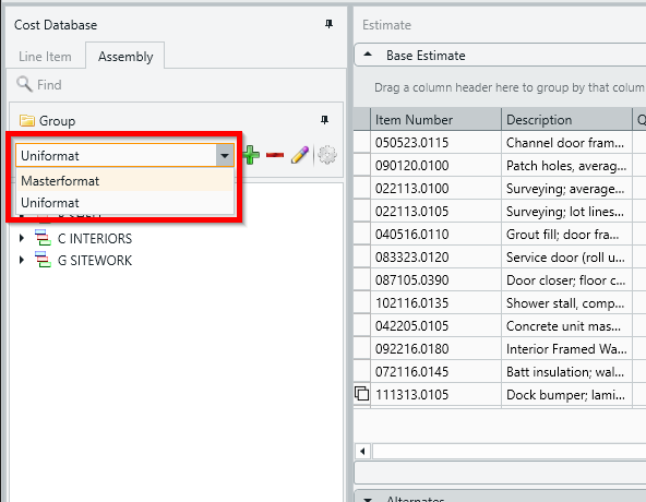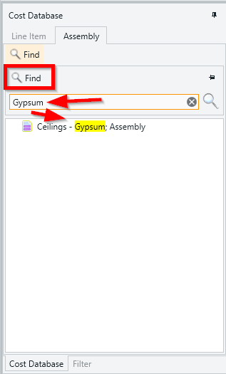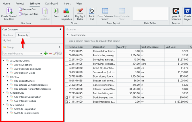 Assemblies are accessed via the Cost Database pane in the Estimate View. The Cost Database pane has a Line Items tab and an Assembly tab - select the Assembly tab.
