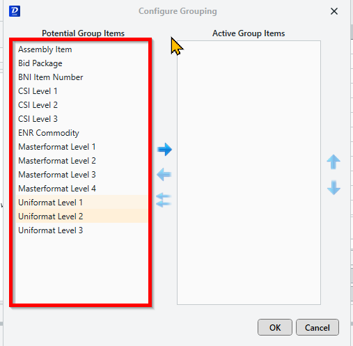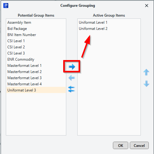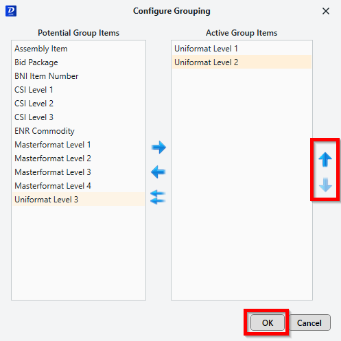 The order of the Active Group Items determines the hierarchy of the Assembly grouping. Use the Up and Down arrows on the right to change the order to your liking. Once you're done, click OK to close the window.