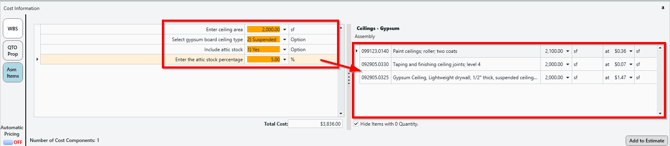 You will now have those line items in your estimate, with the quantities that you specified in your answers, and populated with the costs as per your Cost Database.