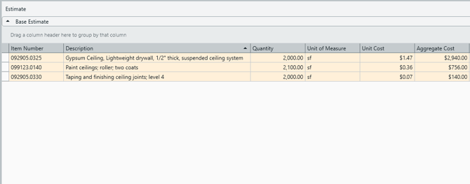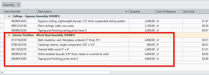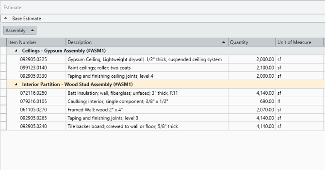 You will now see that the Assembly group is in the grouping header, and your line items are grouped by their associated assembly. Below, you can see we have two assemblies in our estimate:
