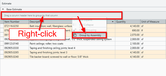 First you need to set the Assembly grouping in your Estimate View. Right-click in the grouping header and select Group by Assembly.