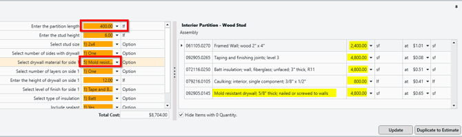 Now, you can make changes to an assembly by modifying your answers to the questions. In this example, we are going to extend the partition length to 400lf, and switch out the Cement Bond drywall for Mold Resistant drywall. This will give you a view of both quantities being updated, and line items being completely changed in the estimate.