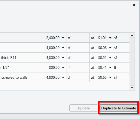 This handy button give you a quick way to add multiple of the same assembly to your estimate. Simply click the overline of the assembly you want to duplicate to populate the Cost Information View. Then, you can make any changes via the Questions on the left, and click Duplicate to Estimate to add those line items to the estimate.