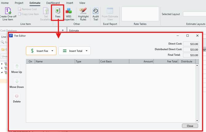 In the Estimate View, click on the Fees button to open the Fee Editor.