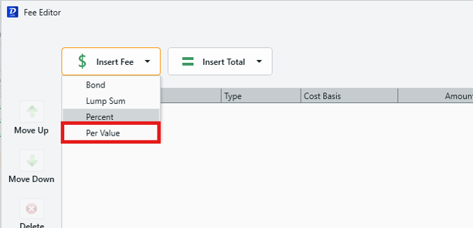 The Per Value fee type is intended to simplify the ability to report and show a fee per a dollar amount (commonly 'per $1,000').