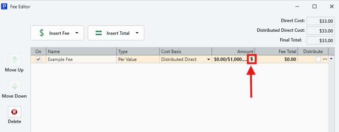 When you add a Per Value fee to the Fee Table, you will see the default per dollar values appear in the Amount column. Click the '$' sign in that column to open the Per Value window.