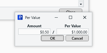 Set the Amount to apply, and the Per Value to apply that amount to, then click OK. Example: Entering $0.50 / $1,000, equates to a 0.05% fee (0.50 /1,000 x 100)