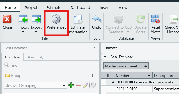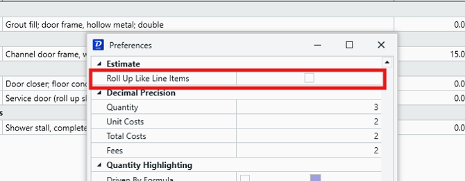 There are two ways to enable/disable Line Item Roll Up; via the Estimate View (recommended), or via the Preferences menu.