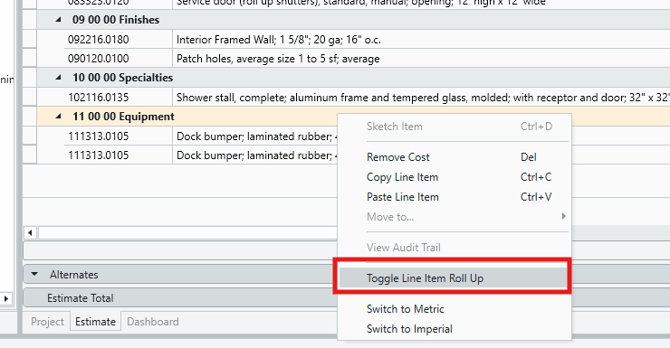 - The easiest way to enable/disable Roll Up is via the right-click menu from within the Estimate View. Simply right-click anywhere in the Estimate View, and click Toggle Line Item Roll Up.