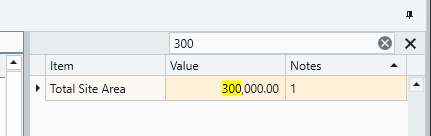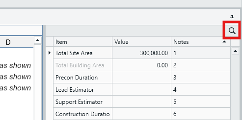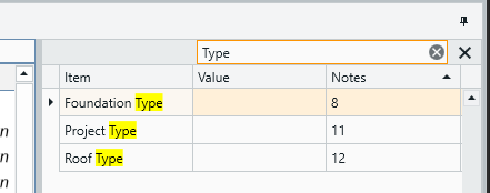 This search function is not limited to the names of the Project Properties - it will pull matched results found in all three columns (Item, Value, and Notes). So you can search a name...