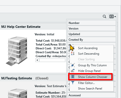 Estimates Tab: The Estimate folder is a database-wide search. All estimates containing the words or numbers entered will be displayed. Read section 2 of this article for tips on optimizing your searches.