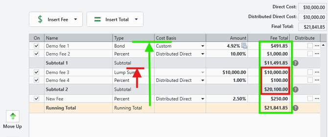 As you can see in the example below, Subtotal 2 (red) only calculates up to (but not beyond) Subtotal 1. Meanwhile, the Running Total (green) calculates on all fees above it (including direct cost).