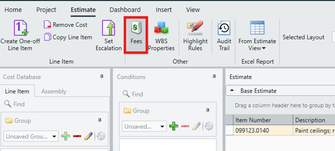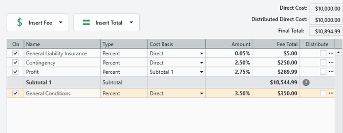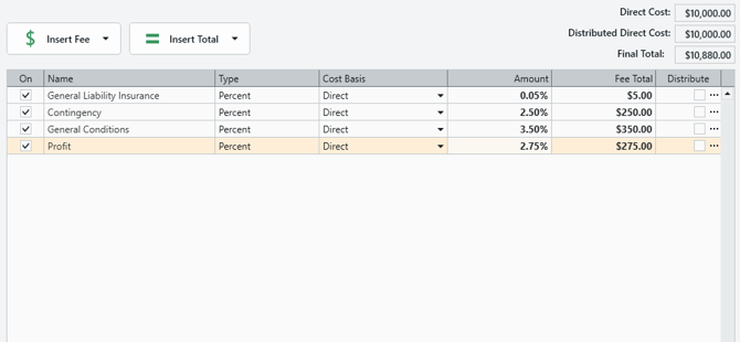 At this stage, all fees are calculated against the estimate’s direct cost, and the total cost for each fee is displayed in the Fee Total column.