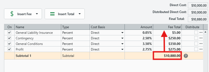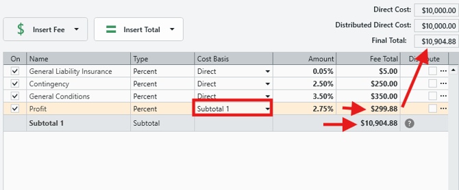 - Fees placed above a subtotal are included in that subtotal’s calculation (along with the direct cost).