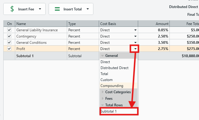 Subtotals in the Fee Editor allow you to calculate fees—such as profit—on top of other fees rather than directly on the estimate’s direct costs. This can be used to calculate things like profit on fees or profit on profit.