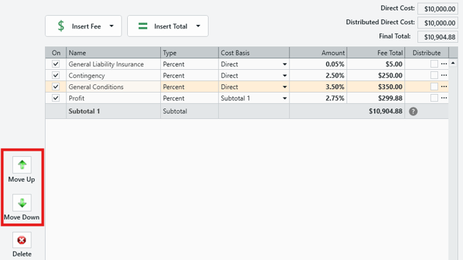 - Use the arrow controls on the left side of the Fee Editor to move fees or subtotals up or down.