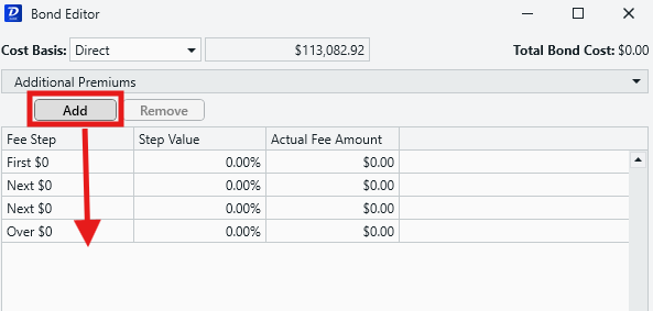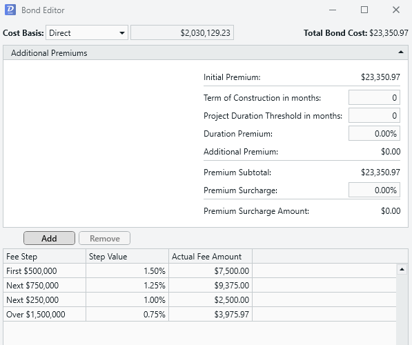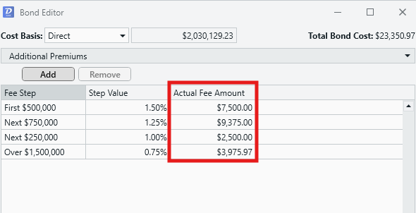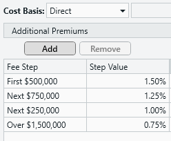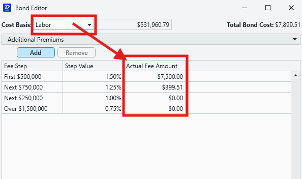 - The Bond Editor window also conveniently provides a dropdown to change the Cost Basis for the fee without having to back out to the main Fee Editor. This is useful for immediately seeing how the selected Cost Basis impacts each Fee Step amount.