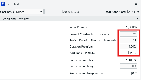 - This is where you can enter the Term of Construction and set a Project Duration Threshold, along with a Duration Premium.