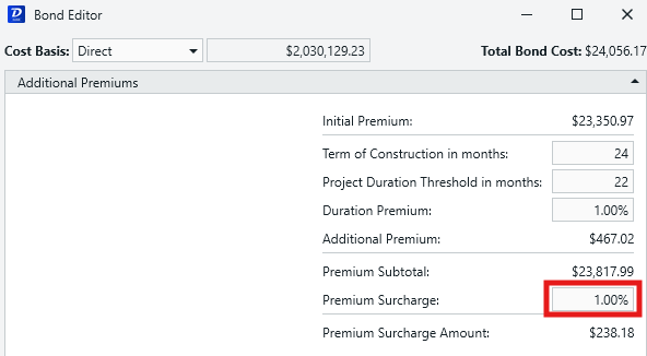 - The Additional Premium field displays the calculated value of any applied premiums.