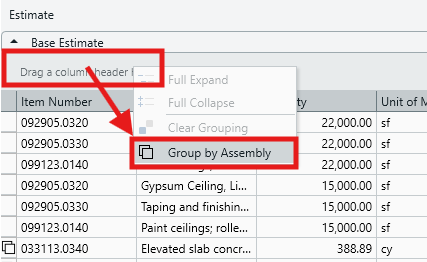 - In the Estimate View, right-click on the Grouping header and select Group by Assembly.