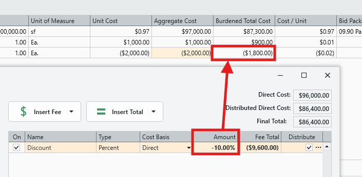 In some estimates, you may include a negative fee—such as a discount—and choose to distribute that fee back across your estimate line items. While this behavior is straightforward when all line items have positive costs, it can become more complex when negative-cost items are also present.