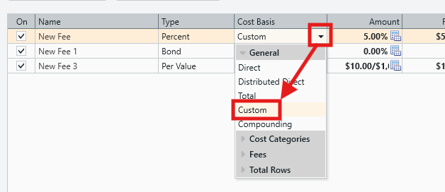 - Note that the Custom Cost Basis is not applicable to the Lump Sum fee type. This workflow will only apply to the following fee types: