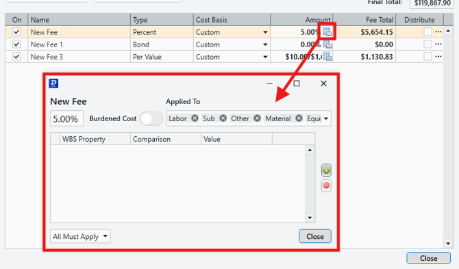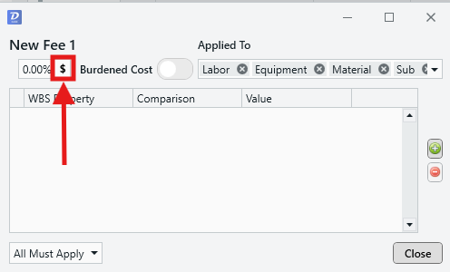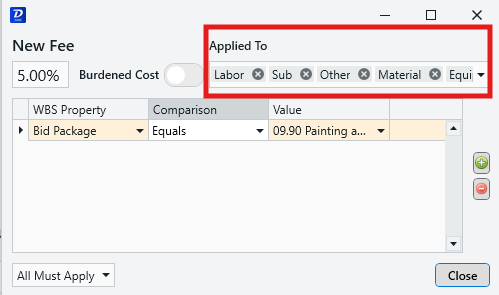- Applied to: Set which cost categories (Labor, Equipment, Material, Sub, Other) that the fee will be applied to.