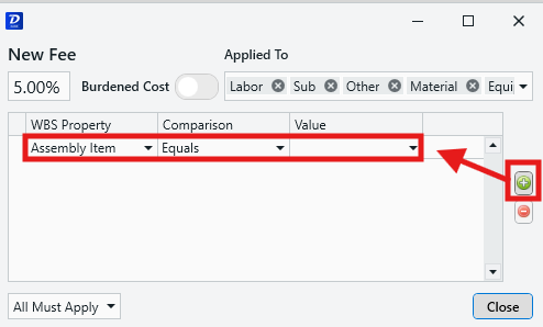 - Any Can Apply: The fee will be distributed to line items that meet any of the listed criteria. This is useful if you have several separate conditions that you'd like to specify for distribution.