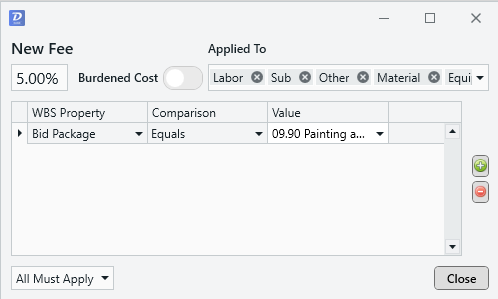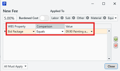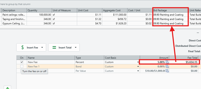 - In the below example, we have configured our fee to calculate against line items that are in the '09.90 Painting and Coating' Bid Package.
