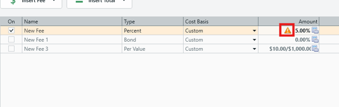 - If the fee cannot be applied to any line items, a yellow warning icon will appear in the Amount column.