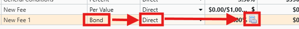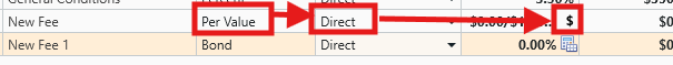 - Click the Dollar symbol as indicated below to access the Bond Editor (Bond fee) or the Per Value editor (Per Value fee).