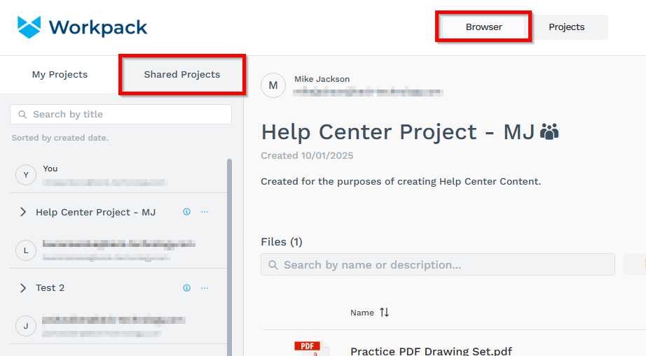 - To view other users’ projects, use the search bar above the Creator column or switch to the Browser and select Shared Projects.