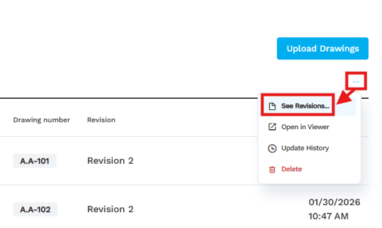 Click the ellipses to the right of the drawing set and select See Revisions.