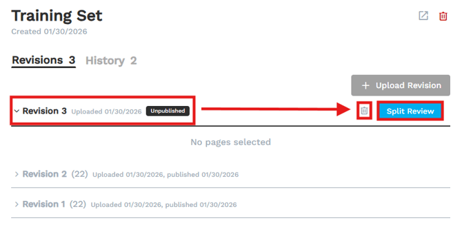 - Click on the affected drawing set. The Split Review button will appear to the right. Now, you can click Split Review to review and publish the revision.