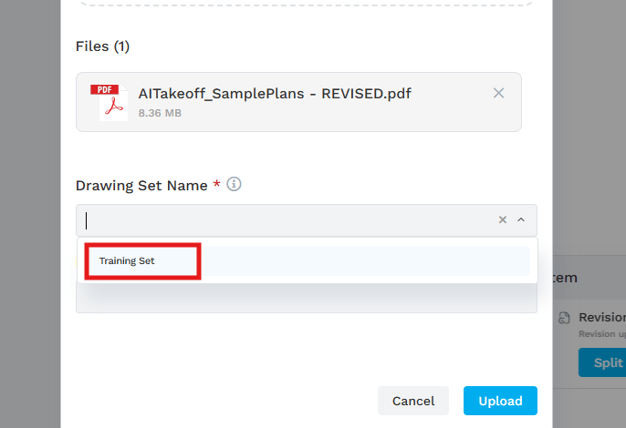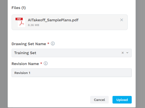Enter a Drawing Set Name and Revision Name, then click the Upload button.