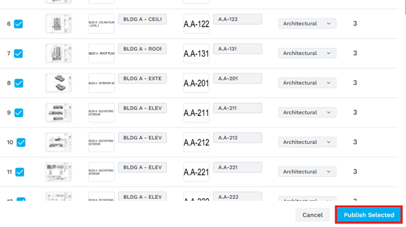 - Once you have completed your review, select the pages you wish to publish to your project (use the upper-most checkbox to select all pages if desired) and click Publish Selected.